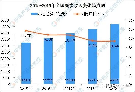 餐饮收入平稳增长。2019年餐饮收入比上年增长9.4%,增速与上年基本持平,快于同期商品零售1.5个百分点;其中限额以上单位餐饮收入增长7.1%,增速比限额以上单位商品零售额快3.4个百分点,比上年加快0.7个百分点。快餐、特色餐饮企业营业额增速加快。在限额以上餐饮企业中,快餐服务、饮料及冷饮服务、餐饮配送及外卖送餐服务企业营业额分别比上年增长12.6%、24.5%和22.5%,增速分别比上年加快2.2、8.7和3.7个百分点。