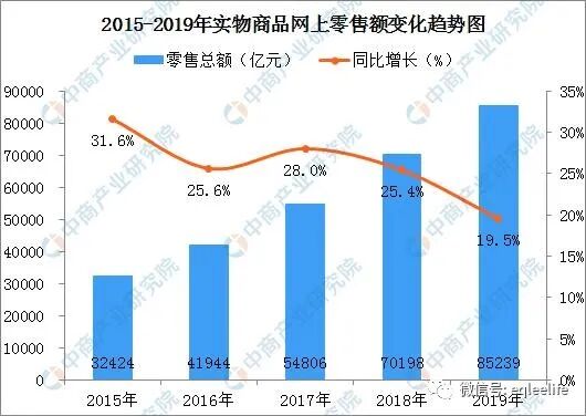新兴零售业态快速发展。随着物流配送体系的完善以及网购用户数量的增多,网上零售继续保持快速增长。2019年,全 实物商品网上零售额比上年增长19.5%,增速比社会消费品零售总额快11.5个百分点,占社会消费品零售总额的比重为20.7%,比上年提高2.3个百分点。 家邮政局预计2019年快递业务量和业务收入分别完成630亿件和7450亿元,分别增长24%和23%。据测算,实物商品网上零售额对社会消费品零售总额增长的贡献率超过45%。