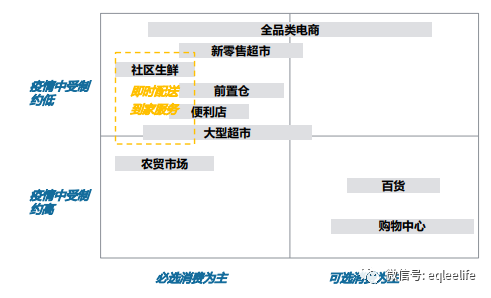 本次疫情对于不同零售渠道的影响程度差异巨大。整体来看:综合电商、即时配送/到家服务以及新兴业态的“新零售超市”满足了本次疫情中对“非接触性”服务的需求。在疫情期间,新增用户量有望增加.受“棘轮效应”的影响.疫情结束后,新增客户留存将使得上述渠道受益。其中.即时配送/到家服务和“新零售超市”将获得较大的长期收益。