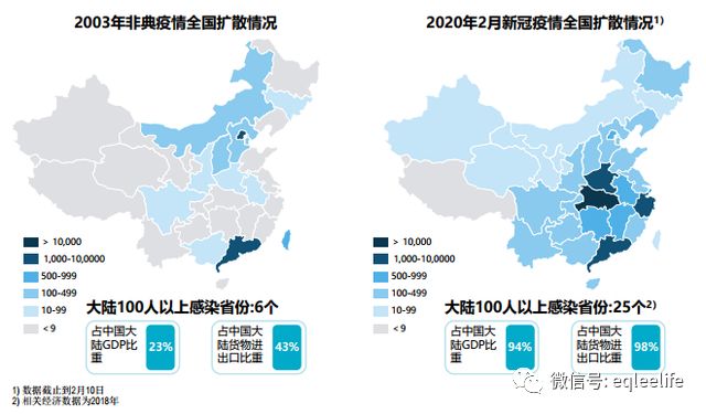 非典”疫情主要疫区呈散点式分布,疫情期间有6个省份感染人数超过 人。而新冠疫情以中部省区为核心迅速蔓延。截止2月10日已经有25个省区感染人数超过 人。